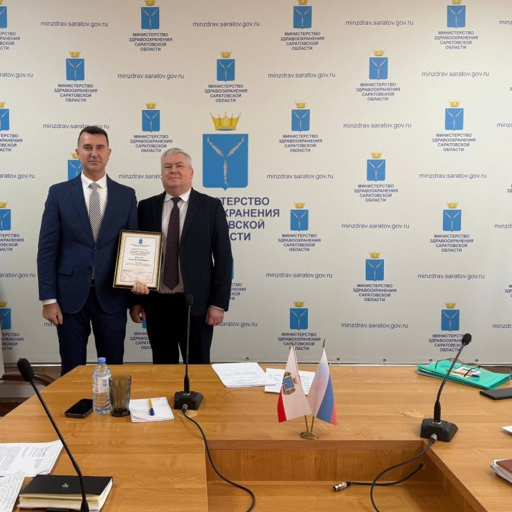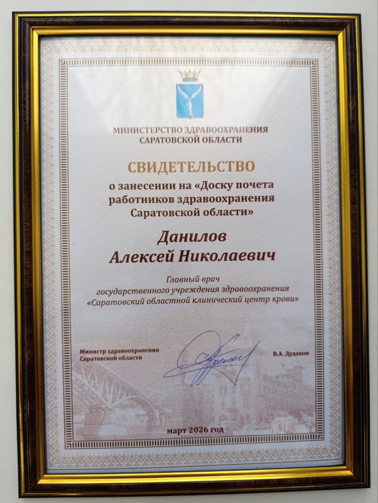 Свидетельство о занесении на «Доску почета работников здравоохранения Саратовской области» вручено главному врачу Саратовского областного клинического Центра Крови, доктору медицинских наук, профессору Алексею Николаевичу Данилову