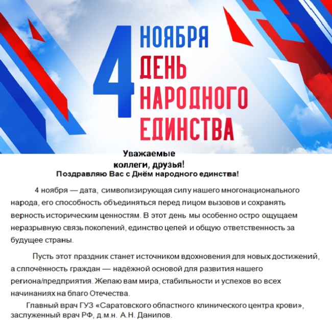 4 ноября — дата, символизирующая силу нашего многонационального народа, его способность объединяться перед лицом вызовов и сохранять верность историческим ценностям. В этот день мы особенно остро ощущаем неразрывную связь поколений, единство целей и общую ответственность за будущее страны.