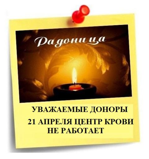 ❗ ВНИМАНИЕ ДОНОРАМ 📅 21 АПРЕЛЯ — Центр Крови и его подразделения НЕ РАБОТАЮТ ‼ ✅ В соответствии с Законом Саратовской области № 26-ЗСО от 22.03.2012 г. день особого поминовения усопших — Радоница на территории региона является нерабочим днём. 💥 Радоница— древний весенний языческий праздник восточных славян. Этимологически слово Радоница восходит к корню рад- (радование, […]