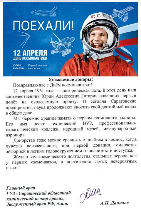 Уважаемые доноры! Поздравляю вас с Днём космонавтики! 12 апреля 1961 года — историческая дата. В этот день наш соотечественник Юрий Алексеевич Гагарин совершил первый полёт на околоземную орбиту. И сегодня Саратовские предприятия, наука продолжают вносить свой достойный вклад в общее дело. Мы бережно храним память о первом космонавте планеты. Его имя носят технический ВУЗ, профессионально-педагогический […]